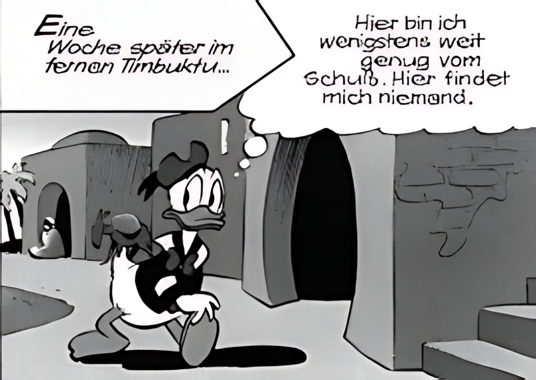 Da die Stadt Jahrhunderte lang den legendären Ruf eines Ortes hatte, der weit weg und nahezu unerreichbar ist, geriet er in Europa unter anderem zum Synonym für einen weit entlegenen Ort, dessen reale Existenz nicht einmal belegt ist. In dieser Funktion erscheint der Name in verschiedenen Sprachen, unter anderem im Deutschen, Niederländischen und Englischen. Daher war für angelsächsische Leser beziehungsweise Kinogänger der Witz stets sofort klar, wenn Donald Duck in den Comics von Carl Barks am Ende einer Geschichte entweder freiwillig, aus Angst vor Strafe, oder erzwungenermaßen in diese mystische Stadt emigrierte. Im letzten Bild solcher Comics sieht man ihn meist in die Ferne aufbrechen, einem Wegweiser mit der Aufschrift „Timbuktu“ folgend. In Disneys Aristocats wird der böse Butler Edgar am Schluss in einen Koffer gesperrt, auf dem ein Schild mit dem Zielort Timbuktu prangt. In der Comicserie Garfield wird der Name oft verwendet, entweder als Adresse auf einem Paket (in welches Garfield die Jungmieze Nermal gestopft hat) oder, wie bei Donald Duck, als Fluchtort.